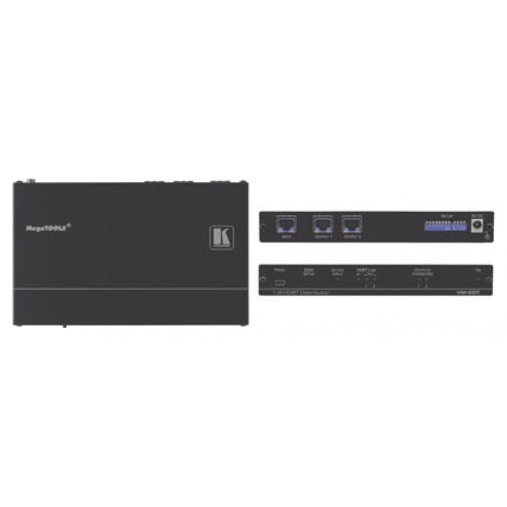 VM?2DT es un extensor de rango y distribuidor de alta calidad para señales 4K@60Hz (4:2:0) HDBaseT. Este equipo ecualiza y regenera la entrada HDBaseT y la distribuye a dos salidas idénticas HDBaseT.