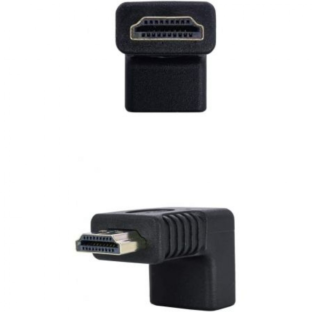 Adaptador HDMI acodado con conector HDMI tipo A macho en un extremo y HDMI tipo A hembra en el otro