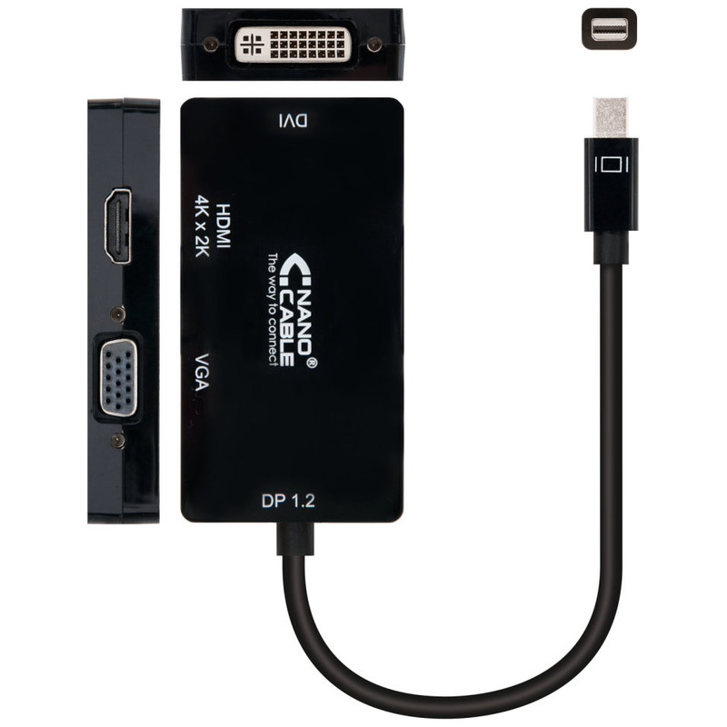 - 1 x Conversor Mini Displayport a VGA / DVI / HDMI, 3 en 1, DP 1.2/M-VGA/H-DVI/H-HDMI 4K, negro, 15 cm
