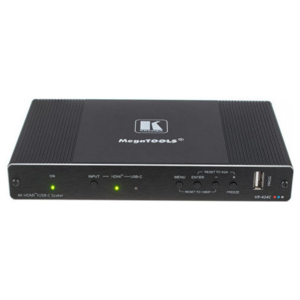 Kramer VP-424C Digital Scaler 18G 4K HDMI to HDMI ProScale Digital Scaler with HDMI and USB-C inputs upscaling or downscaling of HDMI and USB-C signals in any resolution up to 4K@60 (4:4:4:4) supports HDMI 2.0 and HDCP 2.2/1.4 features Input Auto-Switching, Constant Sync on output even if the input video signal is lost or interrupted built-in ProcAmp for easy signal adjustment Fast, smooth manual and automatic switching between sources OSD menu and input selection on front panel Technical data: Input: 1x HDMI / 1x USB-C Output: Max. Input resolution: 4K@60Hz (4:4:4) Max. Data rate: 18Gbps (6Gbps per graphic channel) Latency: 1-2 frames Power supply: external power supply 5 V DC 1.8 A (included) Housing: aluminium Cooling: convection Dimensions: 18.8 x 11.5 x 2.5 cm Weight: 0.5 kg,