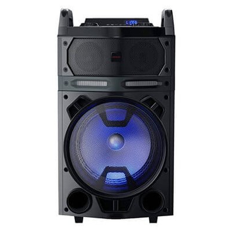 Altavoz portátil con función Karaoke y carro. Asa y ruedas para facilitar su transporte. Radio FM. Espectáculo de luces LED. Entrada de audio: se puede conectar con ordenadores personales, teléfonos móviles, DVD, VCD, CD, LD, TV, MP3, radio, piano electrónico y cualquier dispositivo que tenga salida de audio. Salida de audio: se puede conectar con otro altavoz que tenga entrada de audio. Volumen de música automático reducido cuando la prioridad del micrófono está activada. Control de volumen del micrófono. Control de volumen de eco. Entrada de guitarra y control de volumen. Control de volumen de graves y agudos. Ecualizador de 5 bandas. Sistema de karaoke con 2 micrófonos inalámbricos incluidos. Pantalla LED. Cuna incorporada para teléfono / tableta. Altavoz de 3 vÃas: 12 ? + 4 ? + 1 ?. Potencia de salida 600W. 80W RMS.