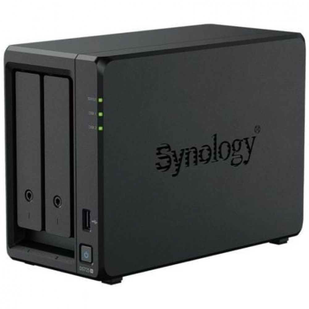 El DS725+ cuenta con conectividad 2.5GbE integrada y admite tanto SSDs SATA como HDDs en bahías internas de 2.5"/3.5", así como unidades M.2 NVMe a través de ranuras M.2 para su uso como caché.