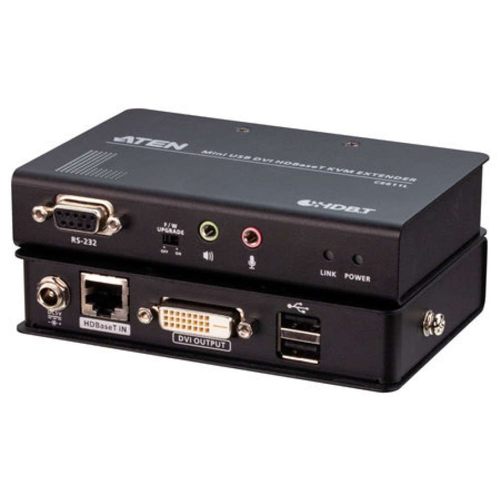 El ATEN CE611 es un extensor de KVM HDBaseT™ DVI USB que integra las últimas tecnologías HDBaseT™ para transmitir señales de vídeo DVI 1920 x 1200, audio estéreo, USB y RS-232 a una distancia de hasta 100 metros a través de un solo cable Cat6 / 6a / cable Cat 6 ATEN 2L-2910. Este asequible extensor presenta un diseño compacto que incluye interfaces de DVI/audio, puertos USB 2.0 de máxima velocidad y una consola serie que responde a la mayoría de demandas de consola y control de KVM. Con una sencilla instalación con un solo cable que admite varias señales, el CE611 resulta ideal para aplicaciones en las que se necesita práctico acceso remoto, como centros de control de transporte, instalaciones médicas, almacenes industriales y estaciones de trabajo ampliadas.\n\nContenido del paquete\n\n- 1x extensor de KVM HDBaseT DVI mini USB CE611L (unidad local)\n- 1x extensor de KVM HDBaseT DVI mini USB CE611R (unidad remota)\n- 2x adaptadores de corriente\n- 1x manual de instrucciones
