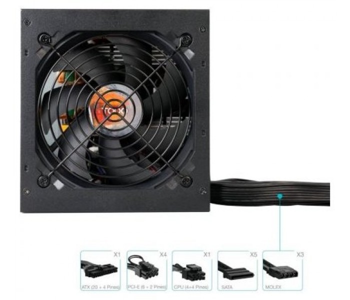 - Conectores: 1 conector ATX (24 pines) - longitud exterior 550 mm, 1 conector CPU (P8 4+4 pines) - longitud exterior 600 mm, 4 conector PCI-E (P8 6+2 pines) - longitud exterior 550+150 mm, 5 conectores SATA y 3 MOLEX - longitud exterior 550+150+150+150 mm