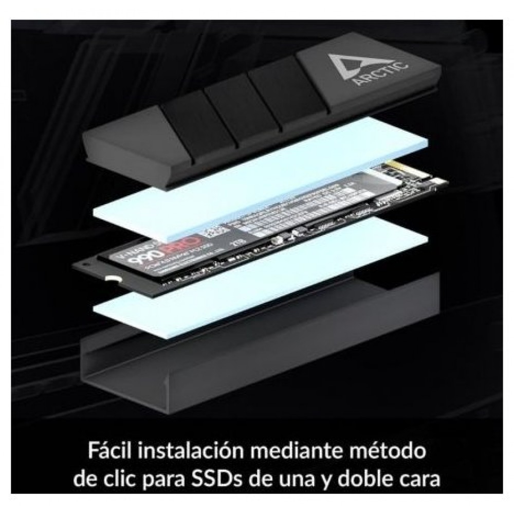 El montaje del ARCTIC M2 Pro no requiere tornillos ni gomas elásticas. En su lugar, el SSD se coloca entre los disipadores mediante un sistema de clic. El disipador NVMe para SSD está diseñado para SSD M.2 2280 de una y dos caras. Las diferencias de altura se compensan con la almohadilla térmica incluida.
