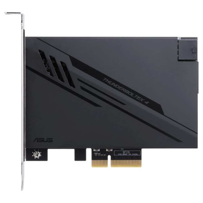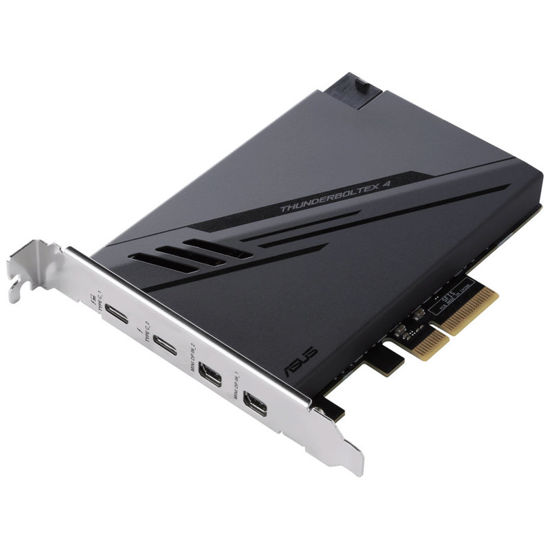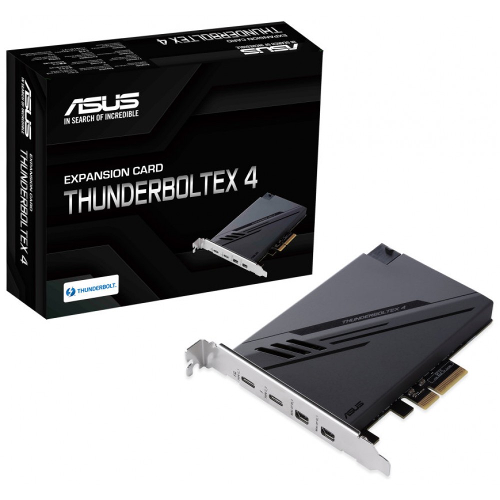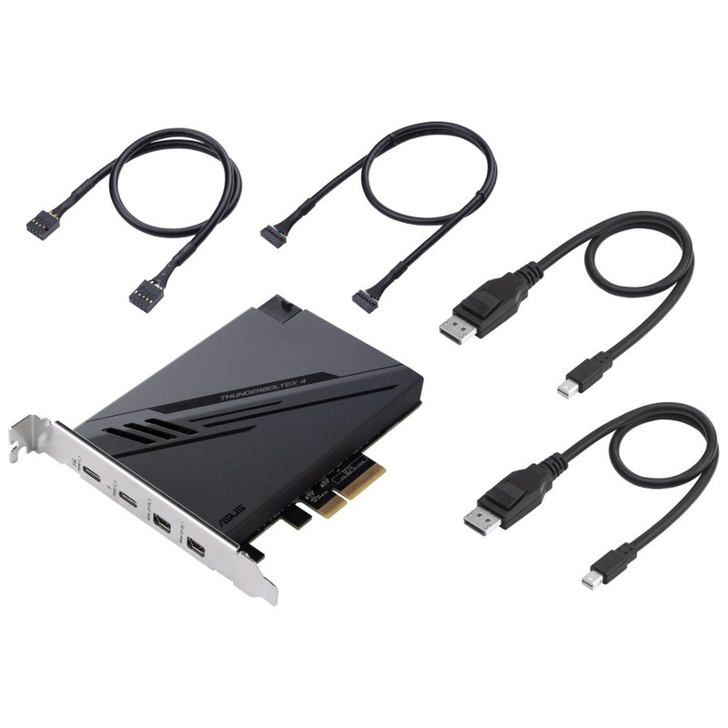 ASUS ThunderboltEX 4. Interfaz de host: PCIe, Interfaz de salida: Mini DisplayPort, PCIe, Thunderbolt, USB 2.0, USB 3.2 Gen 2 (3.1 Gen 2), Estándar de la tarjeta de expansión: PCIe 3.0. Color del producto: Negro, Utilizar con: PC. Circuito integrado: Intel Thunderbolt 4 JHL8540, Tasa de transferencia de datos (max): 40 Gbit/s. Sistema operativo Windows soportado: Windows 10 x64. Ancho: 117,7 mm, Profundidad: 180,5 mm