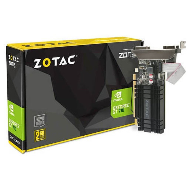 Zotac GeForce GT 710. Familia de procesadores de gráficos: NVIDIA, Procesador gráfico: GeForce GT 710, Frecuencia del procesador: 954 MHz. Capacidad memoria de adaptador gráfico: 2 GB, Tipo de memoria de adaptador gráfico: GDDR3, Ancho de datos: 64 bit, Velocidad de memoria del reloj: 1600 MHz. Máxima resolución: 3840 x 2160 Pixeles. Versión DirectX: 12.0, Versión OpenGL: 4.5, Dual Link DVI. Tipo de interfaz: PCI Express 2.0. Tipo de enfriamiento: Activo, Número de ventiladores: 1 Ventilador(es)