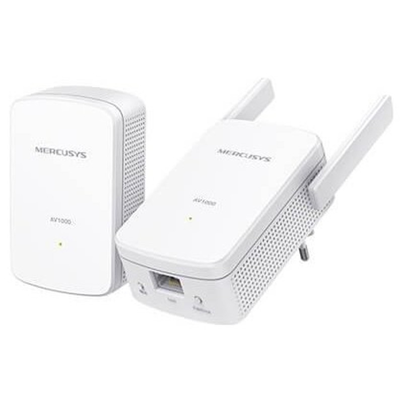 Mercusys MP510 KIT. Rango máximo de transferencia de datos: 1000 Mbit/s, Estándares de red: IEEE 802.11b, IEEE 802.11g, IEEE 802.11n, IEEE 802.3, IEEE 802.3u, Tipo de interfaz Ethernet LAN: Gigabit Ethernet. Consumo energético: 4,29 W. Color del producto: Blanco, Tipo de antena: Externo, Certificación: CE. Sistema operativo Windows soportado: Windows 10, Windows 7, Windows 8, Windows 8.1. Ancho: 112 mm, Profundidad: 84,7 mm, Altura: 39 mm