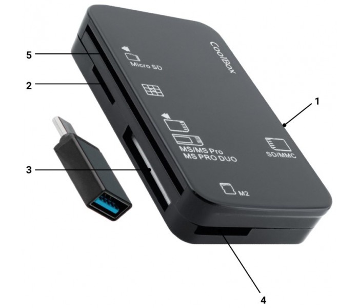 Material: ABS.. Peso: 28 grs.. Diseño super compacto, 68,6 x 37,2 x 16 mm.. Soporta SD/ SDHC/SDXC/MMC/RSMMC/Micro SD/ Micro SDHC/Micro SDXC/MS/MS Pro/MS Duo/MS Pro Duo /M2 Smart Card. Conexiones USB-A y USB-C. PUERTOS:. Puerto 1: SD: SD/ SDHC/ SDXC/ MMC/ RSMMC. Puerto 2: Micro SD: Micro SD/Micro SDHC/Micro SDXC. Puerto 3: MS: MS/MS PRO/MS PRO DUO. Puerto 4: M2. Puerto 5: Smart Card reader, DNIe 4.0, SIM (requiere adaptador)