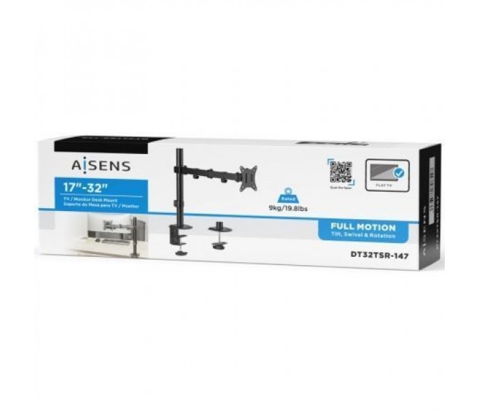AISENS - Soporte De Mesa Eco Giratorio E Inclinable Para Monitor/tv 9kg (3 Pivotes, 1 Brazo) De 17-32, NegroSoporte de mesa eco giratorio e inclinable para monitor/TV (3 pivotes, 1 brazo) de 17”-32”Fabricado con acero de alta resistencia y pintado con pintura electrostática para un acabado perfecto.Se permite la instalación en la mesa a través de abrazadera o de tornillo pasante