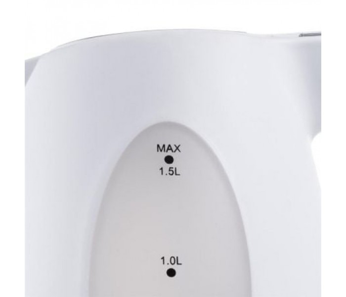 • Hervidora de agua práctica con una carcasa blanca de plástico y un volumen de 1,5 litros.