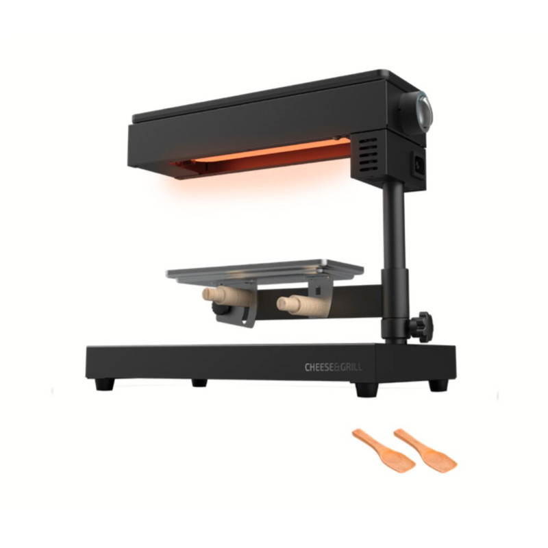 Maquina para Raclette con grill 600W y parrilla superior.? Raclette tradicional de 600 W para derretir el queso en poco tiempo y cocinar al mismo tiempo.? Función grill: parrilla superior para asar todo tipo de verduras o carne a la vez, ofreciendo una experiencia culinaria completa.? Material de acero inoxidable de gran calidad que aporta un diseño único además de una mayor durabilidad y menor adherencia a la suciedad.? Incluye pack de 2 espátulas de madera para un uso más cómodo.? Termostato regulable que permite ajustar la temperatura a la que se quiere derretir el queso.? Material antiadherente en la parrilla superior que ayudará a obtener una fácil y rápida limpieza.? Mango giratorio y reclinable para ajustar la altura de la raclette. Soporte para queso extraíble con asas de madera.? Diseño ligero y compacto que ayuda a obtener un fácil almacenamiento y transporte.? Pies antideslizantes que garantizan la estabilidad del producto y una instalación más firme.