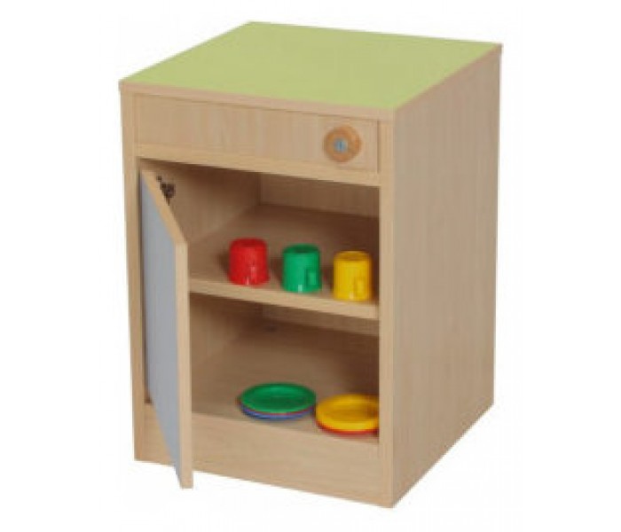Módulo de juego de imitación cocina (lavavajillas). Con mandos móviles en el frontal simulando los botones de una lavavajillas fabricados en haya maciza. Fabricado en melamina de haya de 19 mm de espesor con cantos en PVC de 2 mm acabados por las dos caras. Encimera y puerta en DM melaminizado de 16 mm de espesor con cantos redondeados y barnizados con barniz no tóxico. Trasera de 10 mm. Puerta interior con bisagras superacodadas y diseño de seguridad antiatrapamiento de dedos.Puertas interiores antiatrapamiento de dedos en su cierre.Garantizado por los ensayos realizados en centro tecnológico de certificación de mobiliario TECNALIA.
