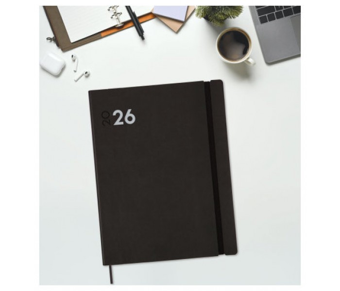 Agenda profesional encuadernada de tapa blanda. Tacto suave muy agradable. Estilo moderno y universal. Perfecta apertura para poder escribir cómodamente. Con goma elástica, cinta punto y esquinas microperforadas para localizar rápidamente el día/semana en curso. Contiene información de interés en la anualidad y otros contenidos extra. Gran formato, ideal para negocios: restaurantes, peluquerías, etc. Duración: Enero 2026 - Diciembre 2026 (12 meses). Interior: 1 Día Página. Amplio espacio de escritura para cada día. Con medias horas. Sábados y domingos en página completa. Con información de los festivos de España. La anualidad contiene: onomástica, festivos nacionales, cambios de estación e inicios de los años nuevos chino, musulmán, ortodoxo y hebreo. Dispone de contenidos extra: datos personales, horarios, fechas para destacar, calendarios, plan anual (2 años), planificación de viajes, festivos nacionales y de las CC. AA., festivos internacionales, usos del teclado, cómo buscar en Google, mapa de Europa y de husos horarios, hojas para anotaciones y tareas, y hojas para teléfonos, direcciones y e-mails. Artículo en español con anualidad multilingüe: español, francés, portugués, euskera e inglés. Formato: Y12 - 210x270 mm. Poliuretano flexible y papel. 80 g/m². Papel FSC®.