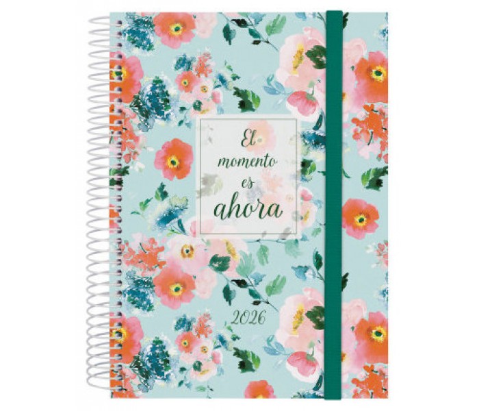 Agenda de espiral con tapas ligeras de polipropileno. Diseño en tendencia y a la moda. Ideal para uso personal y/o profesional. Con goma elástica. Con esquinas microperforadas para localizar rápidamente el día/semana en curso. El diseño interior es limpio y fácil, con espacio suficiente para organizar tus proyectos, tareas y compromisos. Agenda con información de interés en la anualidad y otros contenidos extra orientados a la organización personal. Formato similar a DIN A5 con las ventajas de una agenda portable y una de sobremesa. Duración: Enero 2026 - Diciembre 2026 (12 meses). Interior: 1 Día Página. Amplio espacio de escritura para cada día. Con horas. Sábados y domingos en página completa. Con información de los festivos de España. La anualidad de la agenda incluye la información relativa a: onomástica, festivos nacionales, cambios de estación e inicios de los años nuevos chino, musulmán, ortodoxo y hebreo. La agenda dispone también de otros contenidos extra: datos personales, calendarios, horarios, objetivos del año, plan anual, fechas importantes, otras fechas, hojas para checklist, hojas para notas, hoja para ocio y hojas para teléfonos, direcciones y e-mails. Artículo en español con anualidad multilingüe: español, euskera, gallego y catalán. Formato: E10 - 155x212 mm. Tapas de polipropileno, espiral simple metálica y papel. 70 g/m². Papel FSC®.