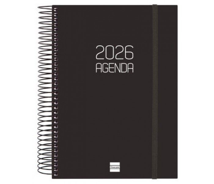 Agenda de espiral de estilo moderno y universal con tapas ligeras de polipropileno. Con goma elástica. Con esquinas microperforadas para localizar rápidamente el día/semana en curso. Agenda con información de interés en la anualidad y otros contenidos extra. Formato similar a DIN A5 con las ventajas de una agenda portable y una de sobremesa. Duración: Enero 2026 - Diciembre 2026 (12 meses). Interior: 1 Día Página. Amplio espacio de escritura para cada día. Con horas. Sábados y domingos en página completa. Con información de los festivos de España. La anualidad de la agenda incluye la información relativa a: onomástica, festivos nacionales, cambios de estación e inicios de los años nuevos chino, musulmán, ortodoxo y hebreo. La agenda dispone también de otros contenidos extra: datos personales, horarios, calendarios, planificación anual del año y del año siguiente, festivos internacionales, cómo buscar en Google, usos del teclado, mapa de Europa y de los husos horarios, hojas para notas y hojas para teléfonos, direcciones y e-mails. Idioma del artículo: español. Formato: E10 - 155x212 mm. Tapas de polipropileno opaco, espiral simple metálica y papel. 70 g/m². Papel FSC®.