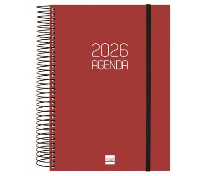 Agenda de espiral de estilo moderno y universal con tapas ligeras de polipropileno. Con goma elástica. Con esquinas microperforadas para localizar rápidamente el día/semana en curso. Agenda con información de interés en la anualidad y otros contenidos extra. Formato similar a DIN A5 con las ventajas de una agenda portable y una de sobremesa. Duración: Enero 2026 - Diciembre 2026 (12 meses). Interior: 1 Día Página. Amplio espacio de escritura para cada día. Con horas. Sábados y domingos en página completa. Con información de los festivos de España. La anualidad de la agenda incluye la información relativa a: onomástica, festivos nacionales, cambios de estación e inicios de los años nuevos chino, musulmán, ortodoxo y hebreo. La agenda dispone también de otros contenidos extra: datos personales, horarios, calendarios, planificación anual del año y del año siguiente, festivos internacionales, cómo buscar en Google, usos del teclado, mapa de Europa y de los husos horarios, hojas para notas y hojas para teléfonos, direcciones y e-mails. Idioma del artículo: español. Formato: E10 - 155x212 mm. Tapas de polipropileno opaco, espiral simple metálica y papel. 70 g/m². Papel FSC®.