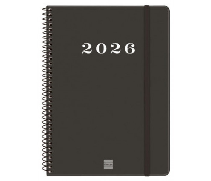 Agenda de espiral de estilo moderno y universal con tapa dura de cartón forrado con peliculado mate antirrayaduras. Ideal para uso personal y/o profesional. Con goma elástica. Esquinas microperforadas para localizar rápidamente el día/semana en curso. Contiene información de interés en la anualidad y otros contenidos extra. Formato similar a DIN A5 con las ventajas de una agenda portable y una de sobremesa. Duración: Enero 2026 - Diciembre 2026 (12 meses). Interior: Semana Vista Horizontal. Visión de la semana completa en horizontal que permite la escritura natural. Con espacio para concretar horario. Con información de los festivos de España. La anualidad de la agenda incluye la información relativa a: onomástica, festivos nacionales, cambios de estación e inicios de los años nuevos chino, musulmán, ortodoxo y hebreo. La agenda dispone también de otros contenidos extra: datos personales, horarios, calendarios, planificación anual del año y del año siguiente, festivos internacionales, cómo buscar en Google, usos del teclado, mapa de Europa y de los husos horarios, hojas para notas y hojas para teléfonos, direcciones y e-mails. Idioma del artículo: español. Formato: E10 - 155x212 mm. Tapas de cartón forrado con peliculado mate antirrayaduras, espiral simple metálica y papel. 80 g/m². Papel FSC®.