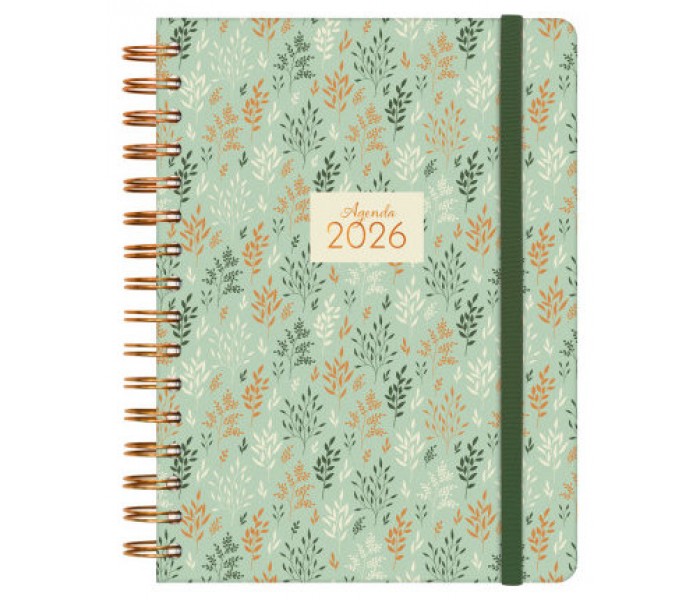 Agenda de espiral con tapa dura de cartón forrado con peliculado mate antirrayaduras. Diseño elegante y en tendencia con detalles estampados metalizados. Ideal para uso personal y/o profesional. Con goma elástica y esquinas microperforadas para localizar rápidamente el día/semana en curso. El diseño interior es limpio y fácil, con espacio suficiente para organizar tus proyectos, tareas y compromisos. Contiene información de interés en la anualidad y otros extra para la organización personal. Además, incorpora un set de adhesivos temáticos. Formato similar a DIN A5 con las ventajas de una agenda portable y una de sobremesa. Duración: Enero 2026 - Diciembre 2026 (12 meses). Interior: 1 Día Página. Amplio espacio de escritura para cada día. Con horas. Sábados y domingos en página completa. Con información de los festivos de España. La anualidad de la agenda incluye la información relativa a: onomástica, festivos nacionales, cambios de estación e inicios de los años nuevos chino, musulmán, ortodoxo y hebreo. La agenda dispone también de otros contenidos extra: datos personales, calendarios, horarios, objetivos del año, plan anual, fechas importantes, otras fechas, hojas para checklist, hojas para notas, hoja para ocio, hojas para teléfonos, direcciones y e-mails y dos hojas de pegatinas orientadas a la organización personal. Artículo en español con anualidad multilingüe: español, euskera, gallego y catalán. Formato: E10 - 155x212 mm. Tapas de cartón forrado con peliculado mate antirrayaduras. Espiral doble metálica. Papel. 70 g/m². Papel FSC®.