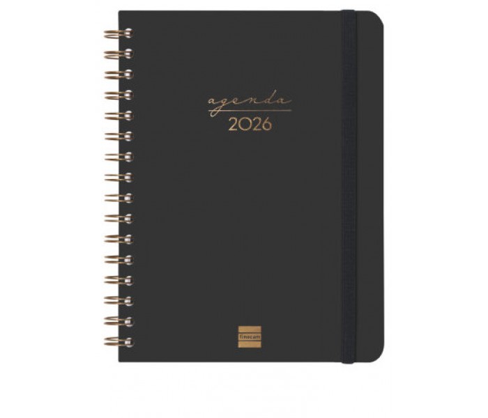Agenda de espiral de tapa dura de cartón forrado con peliculado mate antirrayaduras. Diseño elegante y sofisticado con detalles estampados metalizados. Ideal para uso personal y/o profesional. Con goma elástica y esquinas microperforadas para localizar rápidamente el día/semana en curso. Incorpora un set de adhesivos temáticos. El diseño interior es limpio y fácil, con espacio suficiente para organizar tus proyectos, tareas y compromisos. Contiene información de interés en la anualidad y otros contenidos extra orientados a la organización personal. Formato similar a DIN A5 con las ventajas de una agenda portable y una de sobremesa. Duración: Enero 2026 - Diciembre 2026 (12 meses). Interior: Semana Vista Horizontal. Visión de la semana completa en horizontal que permite la escritura natural. Con espacio para concretar horario. Con información de los festivos de España. La anualidad de la agenda incluye la información relativa a: onomástica, festivos nacionales, cambios de estación e inicios de los años nuevos chino, musulmán, ortodoxo y hebreo. La agenda dispone también de otros contenidos extra: datos personales, calendarios, horarios, objetivos del año, plan anual, fechas importantes, otras fechas, hojas para checklist, hojas para notas, hoja para ocio, hojas para teléfonos, direcciones y e-mails y dos hojas de pegatinas orientadas a la organización personal. Artículo en español con anualidad multilingüe: español, euskera, gallego y catalán. Formato: E10 - 155x212 mm. Tapas de cartón forrado con peliculado mate antirrayaduras. Espiral doble metálica. Papel. 80 g/m². Papel FSC®.