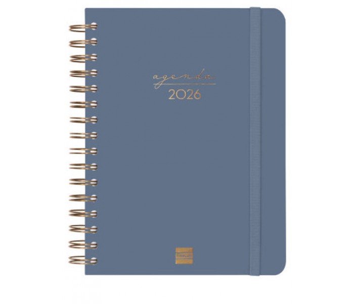 Agenda de espiral de tapa dura de cartón forrado con peliculado mate antirrayaduras. Diseño elegante y sofisticado con detalles estampados metalizados. Ideal para uso personal y/o profesional. Con goma elástica y esquinas microperforadas para localizar rápidamente el día/semana en curso. Incorpora un set de adhesivos temáticos. El diseño interior es limpio y fácil, con espacio suficiente para organizar tus proyectos, tareas y compromisos. Contiene información de interés en la anualidad y otros contenidos extra orientados a la organización personal. Formato similar a DIN A5 con las ventajas de una agenda portable y una de sobremesa. Duración: Enero 2026 - Diciembre 2026 (12 meses). Interior: 1 Día Página. Amplio espacio de escritura para cada día. Con horas. Sábados y domingos en página completa. Con información de los festivos de España. La anualidad de la agenda incluye la información relativa a: onomástica, festivos nacionales, cambios de estación e inicios de los años nuevos chino, musulmán, ortodoxo y hebreo. La agenda dispone también de otros contenidos extra: datos personales, calendarios, horarios, objetivos del año, plan anual, fechas importantes, otras fechas, hojas para checklist, hojas para notas, hoja para ocio, hojas para teléfonos, direcciones y e-mails y dos hojas de pegatinas orientadas a la organización personal. Artículo en español con anualidad multilingüe: español, euskera, gallego y catalán. Formato: E10 - 155x212 mm. Tapas de cartón forrado con peliculado mate antirrayaduras. Espiral doble metálica. Papel. 70 g/m². Papel FSC®.