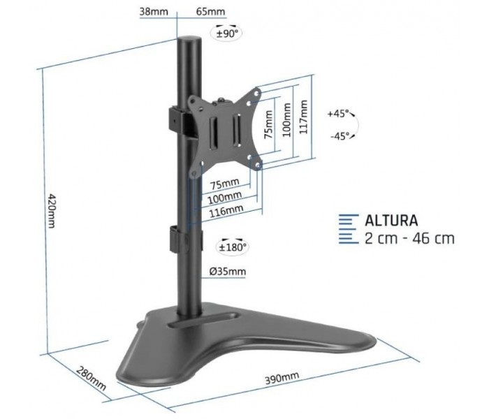 | Caracteristicas | - Soporte de sobremesa para 1 monitor - Tamaño de monitor soportado: 13" (mín) - 32" (máx) VESA mínimo: 75 x 75 mm VESA máximo: 100 x 100 mm - Peso máximo soportado: 8 kg - Ajustable en altura, inclinación, rotación y giro: Altura: 2 cm ~ 46 cm Inclinación: +45° ~ -45° Rotación: +180° ~ -180° Giro: +90° ~ -90° - Color: Negro - Peso neto: 2,8 kg - Base sólida y estable - Sistema integrado de guiado de cables y almacenamiento de llaves Allen - Incluye manual, tornillería e instrucciones de instalación - Cumple especificaciones RoHS |