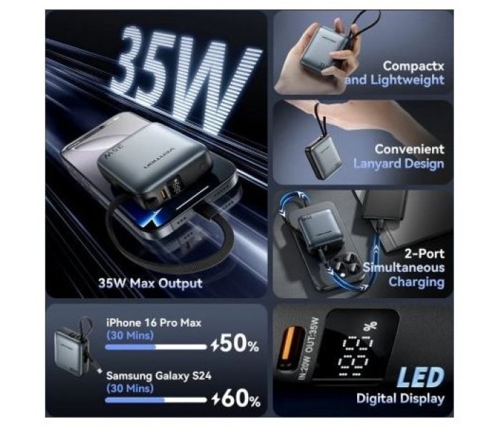 - Salida (cable USB-C integrado): 5V⎓3A; 9V⎓3A; 12V⎓2.5A; 15V⎓2.33A; PPS: 3.3~11V, 3.18A (35W Máx)