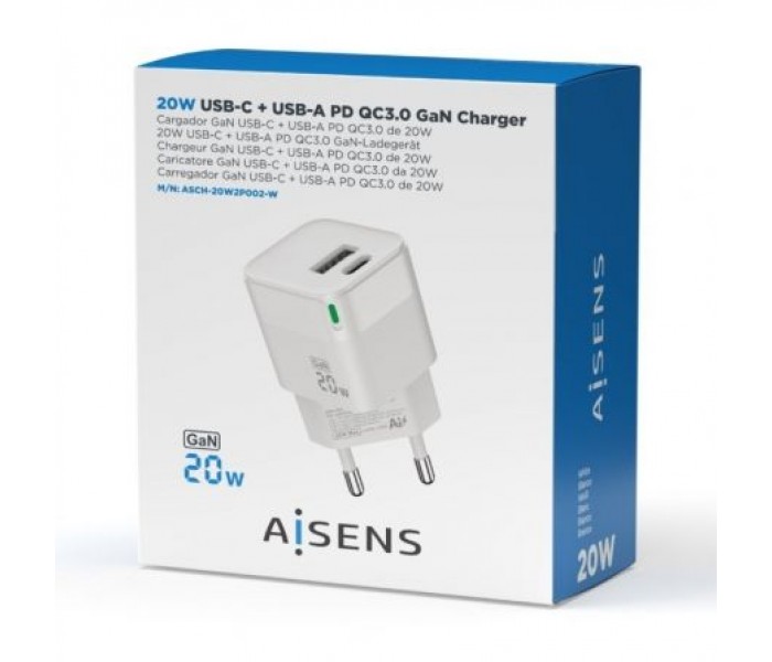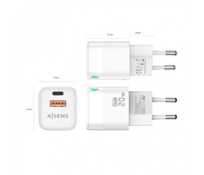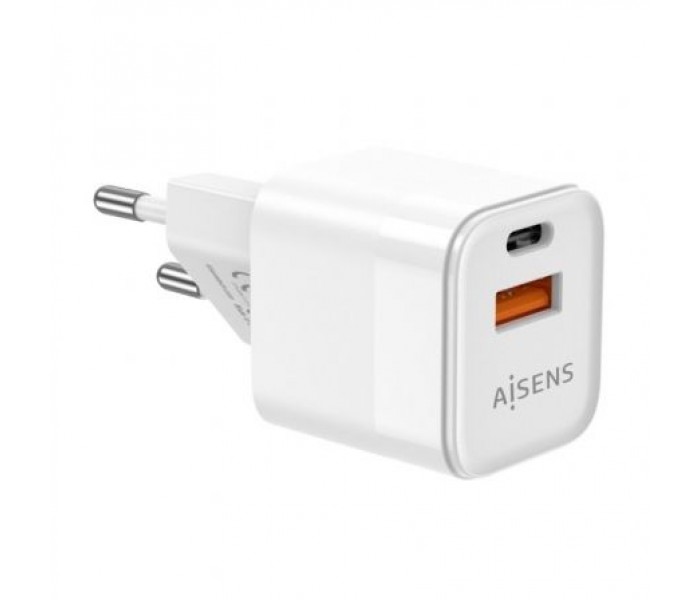 Cargador de Pared GaN Aisens ASCH-20W2P002-W/ 1xUSB Tipo-C/ 1xUSB/ 20W