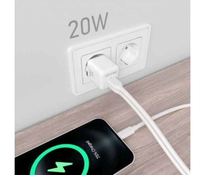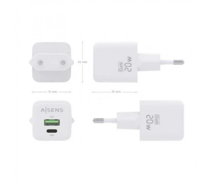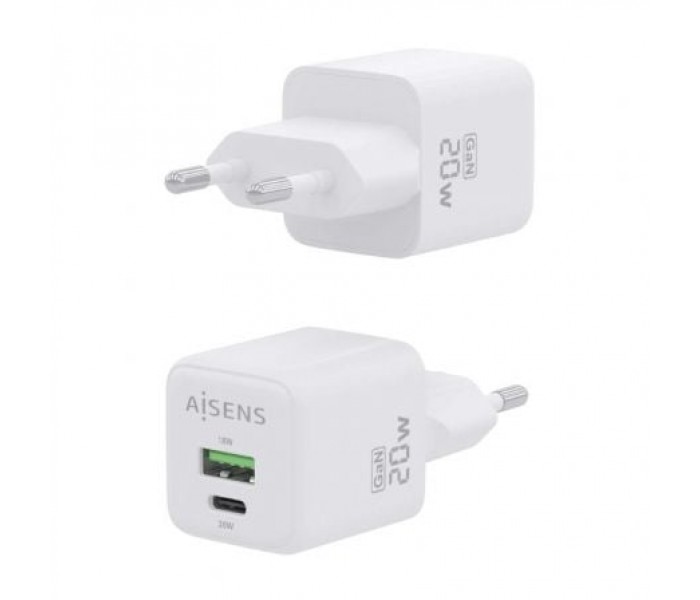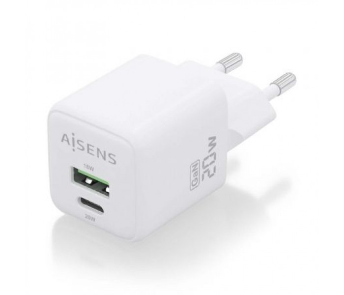 Cargador de Pared GaN Aisens ASCH-20W2P010-W/ 1xUSB Tipo-C/ 1xUSB/ 20W