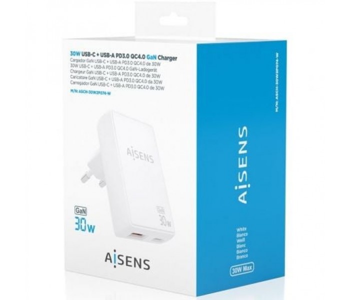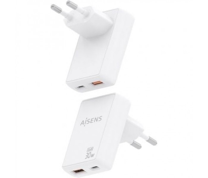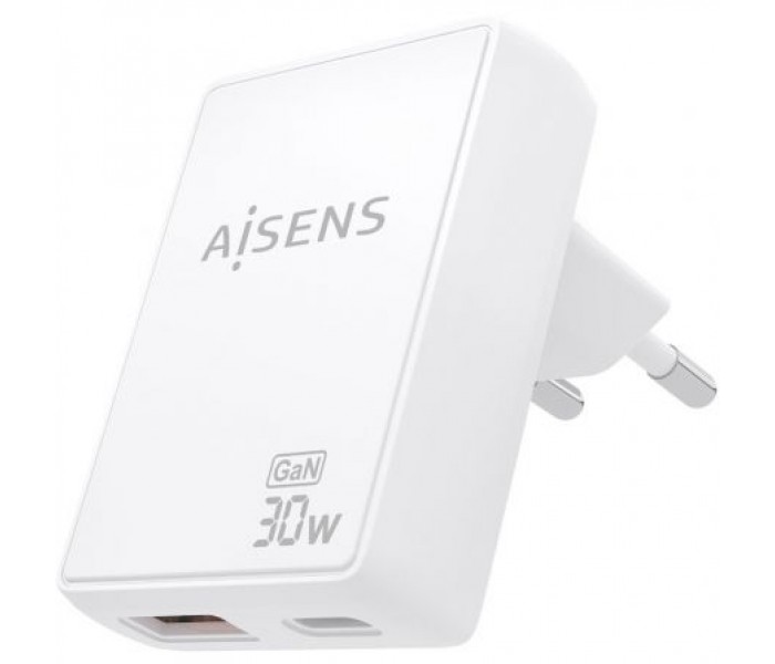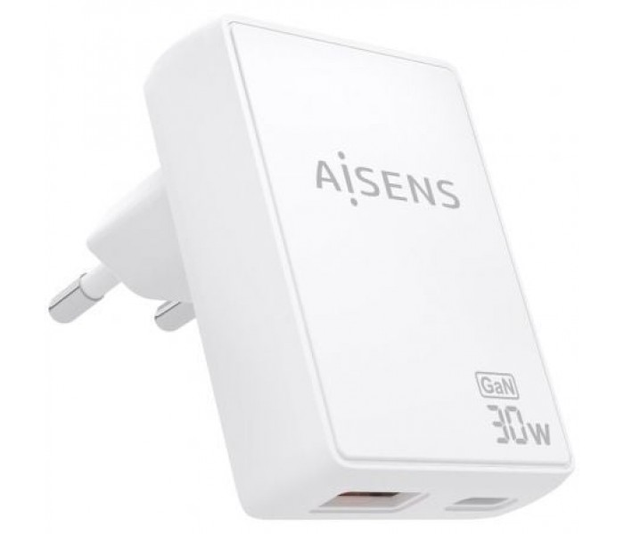 Cargador de Pared GaN Aisens ASCH-30W2P074-W/ 1xUSB Tipo-C/ 1xUSB/ 30W/ Blanco