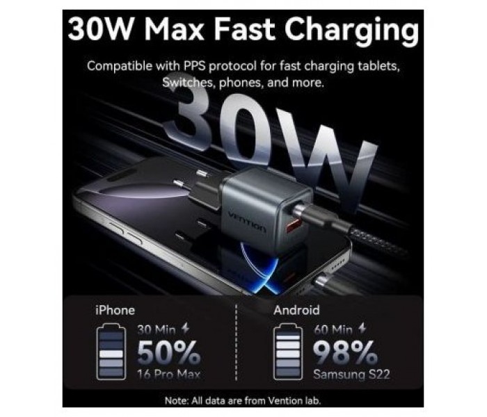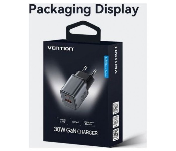 Cargador de Pared GaN Vention FEWH0-EU/ 1xUSB Tipo-C/ 1xUSB/ 30W