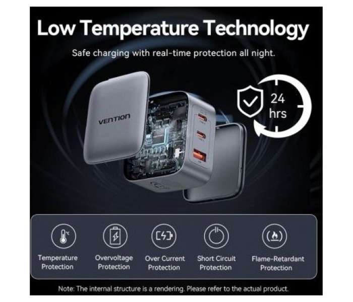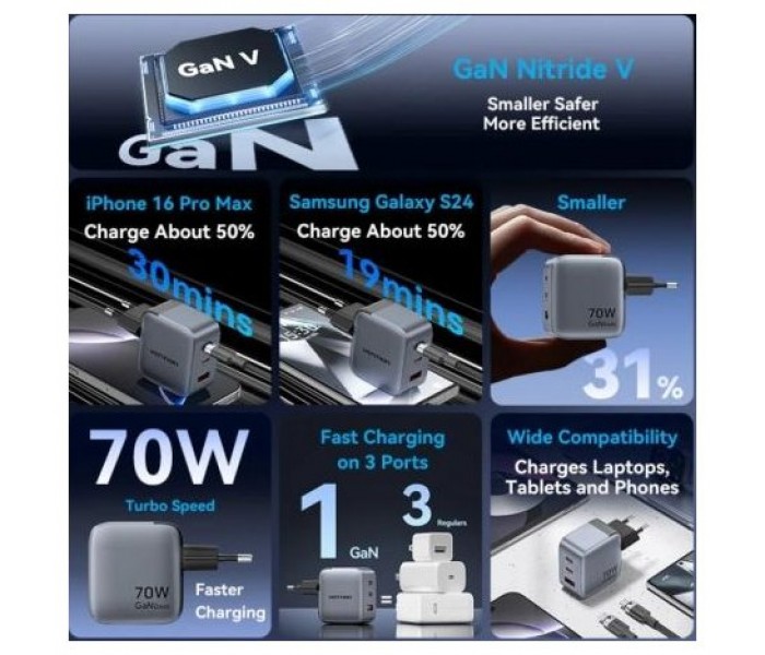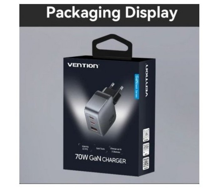 Cargador de Pared GaN Vention FEXH0-EU/ 2xUSB Tipo-C/ 1xUSB/ 70W