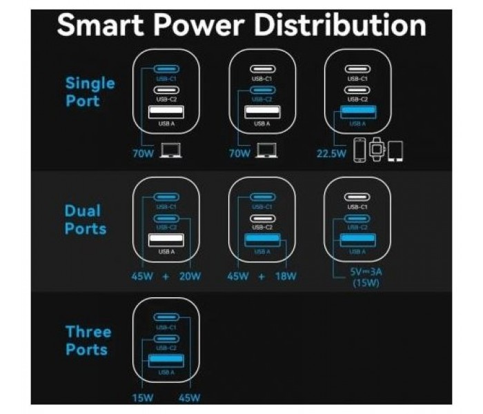 • Salida USB-C1/USB-C2: 5,0V⎓3,0A 15,0W; 9,0V⎓3,0A 27,0W; 12,0V⎓3,0A 36,0W; 15,0V⎓3,0A 45,0W; 20,0V⎓3,5A 70,0W
