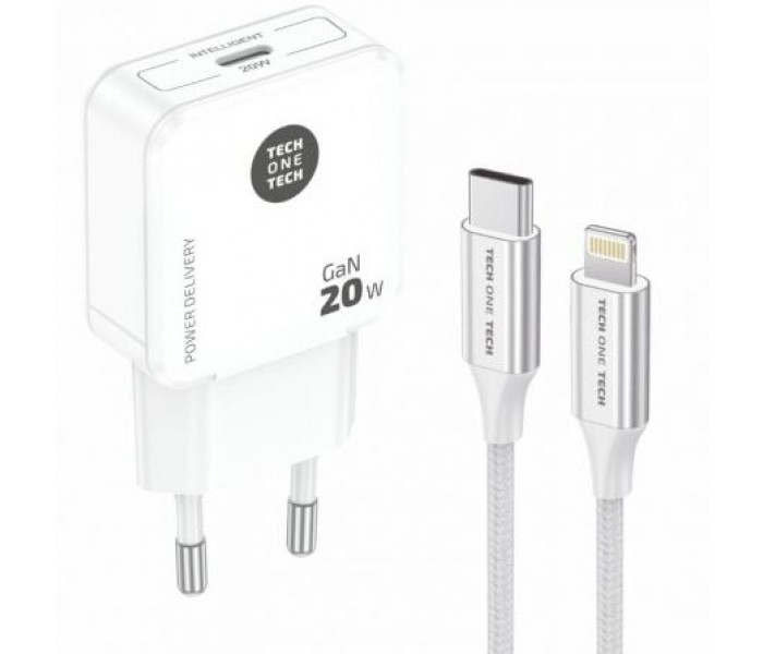 Cargador ultrarrápido con tecnología GaN Power Delivery 3.0 (PD) 20W, color blanco. Carga hasta un 400% más rápido que un cargador estándar de 5W. Compatible con dispositivos anteriores. Conector tipo Apple lightning de 3A. Este cargador permite cargar dispositivos como tabletas, móviles, consolas, baterías, auriculares, etc.