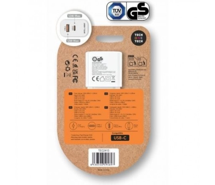 Cargador de Pared Tech One Tech TEC2413/ 1xUSB Tipo-C/ 1xUSB + Cable USB Tipo-C/ 12W/ Blanco