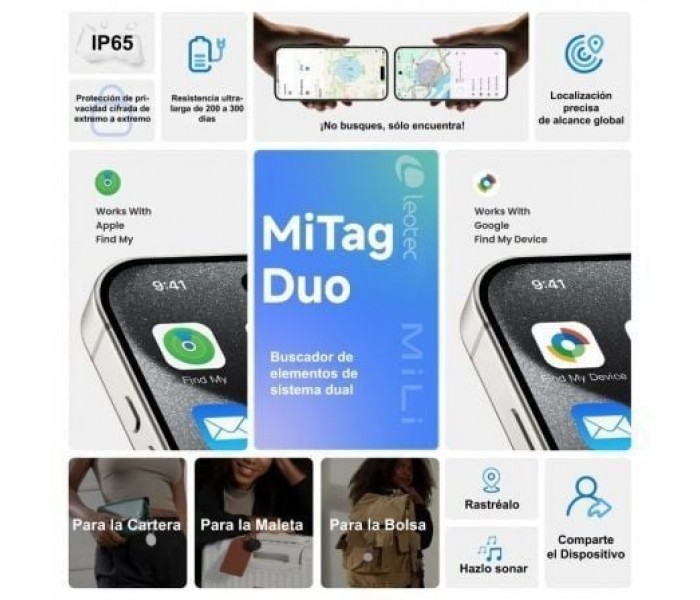 Descubre el nuevo MiTag Duo de leotec, el primer rastreador Bluetooth del mundo con certificación oficial de Apple y Google. Con compatibilidad universal, diseño robusto y una conectividad sin igual, es la solución definitiva para quienes desean cuidar y encontrar lo que más valoran: llaves, cartera, mochila, coche, equipaje, mascotas y mucho más, todo desde su móvil, estés donde estés.