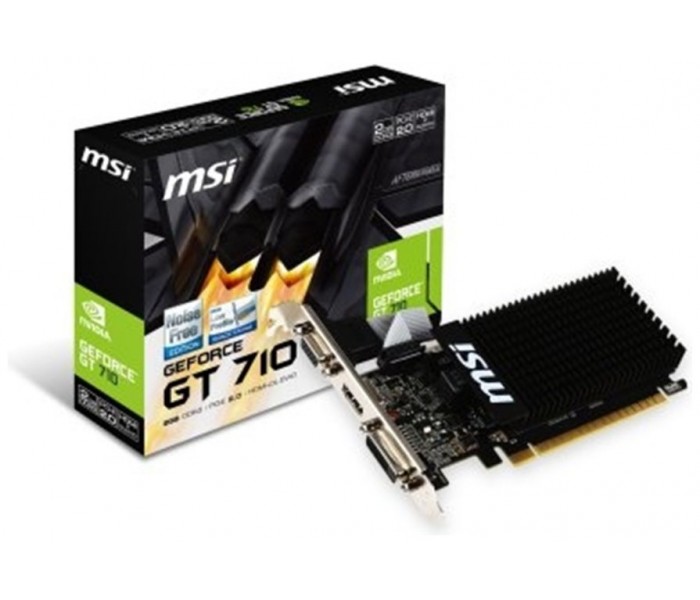 MSI GT 710 2GD3H LP. Familia de procesadores de gráficos: NVIDIA, Procesador gráfico: GeForce GT 710, Máxima resolución: 4096 x 2160 Pixeles. Gráficos discretos memoria del adaptador: 2 GB, Tipo de memoria de adaptador gráfico: DDR3-SDRAM, Ancho de datos: 64 bit. Tipo de interfaz: PCI Express x16 2.0, Versión HDMI: 1.4a. Versión DirectX: 12.0, Versión OpenGL: 4.5. Tipo de enfriamiento: Pasivo, Factor de forma: ATX LP, Color del producto: Negro