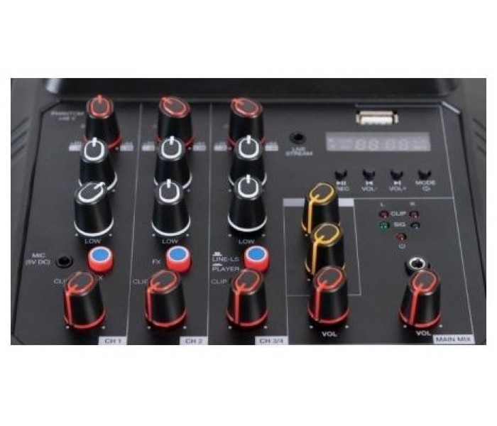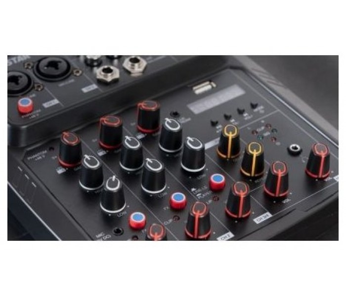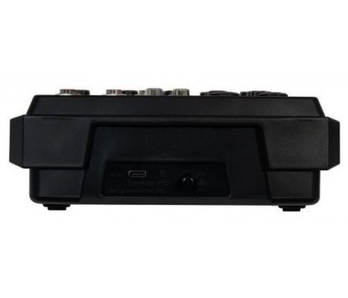 Tiene un tamaño muy reducido y portátil, perfecto para artistas ambulantes, estudios musicales domésticos, pequeños eventos o fiestas, etc. Además, solamente necesita alimentación de 5 V CC, 2"1 A, que puede ser proporcionada por el adaptador, por el puerto USB de un PC o portátil o a través de una power bank, lo que aumenta enormemente la versatilidad y posibilidades de uso de este completo mezclador.