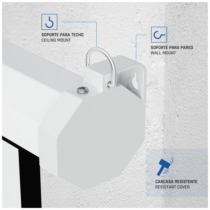 | Características | - Formato 16:9 - Área visible de 92" (159 x 89 cm) - Factor de ganancia: 1.0 - Auto-Stop: ajustable a cualquier altura - Material cajetín: acero - Carcasa blanca y a prueba de polvo - Se puede instalar tanto en techo como en pared - Tela compuesta de 4 capas - Trasera negra opaca - Bordes negros laterales de 3 cm - Fácil montaje - Alta calidad y durabilidad - Ideal para cine en casa y salas de conferencias - Ideal para cualquier tipo de proyector, SVGA, XGA, 3D, HD, Full HD y 4K |