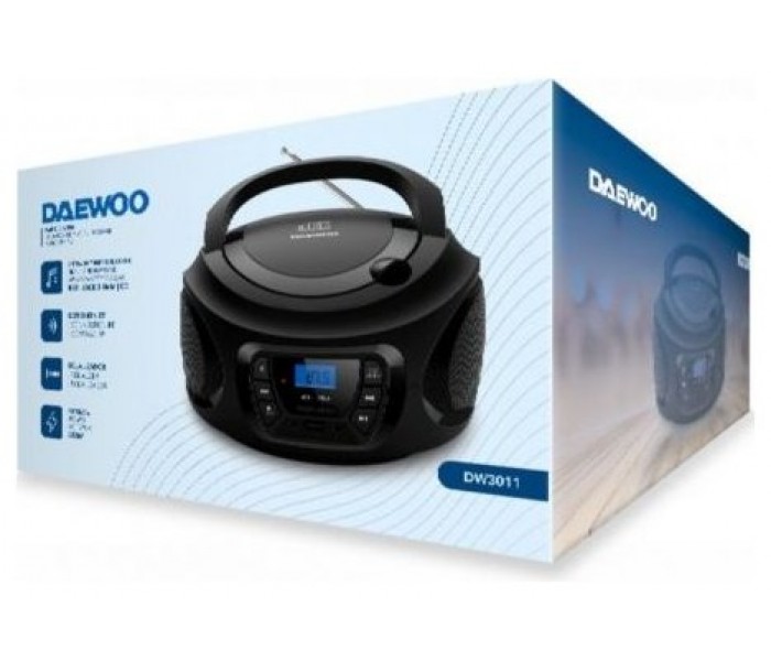 Daewoo DW3011 es una radio CD/FM tipo boombox con Bluetooth, USB, AUX y salida de auriculares, que integra 2×2 W en altavoces estéreo, ecualizador de 5 modos y pantalla LCD. Funciona a corriente AC o con 4 pilas C (LR14) para uso portátil.