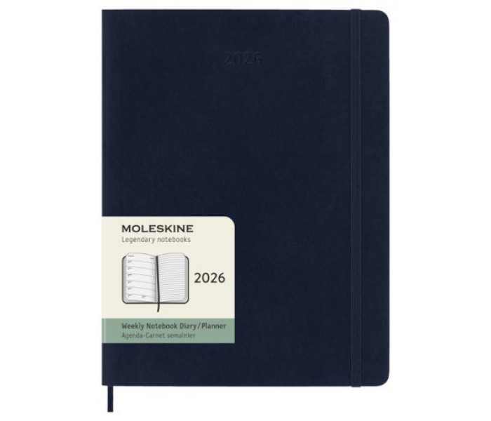 Agenda Extralarge 2026 semana vista tapa blanda Moleskine en color azul zafiro. Página izquierda planificador semanal y pagina derecha hoja rayada para anotaciones. Cierre con goma y cinta marcadora. Contiene herramientas útiles: calendario, planificación de viajes, ideas y objetivos, páginas a rayas para notas. Año grabado en la cubierta delantera. 144 páginas. Esquinas redondeadas. Bolsillo interior expandible. Apertura 180 grados. Incluye una hoja con adhesivos del alfabeto, dos hojas de adhesivos de iconos y adhesivos del año para el lomo. Papel certificado FSC. Tamaño Extralarge 19x25 cm.