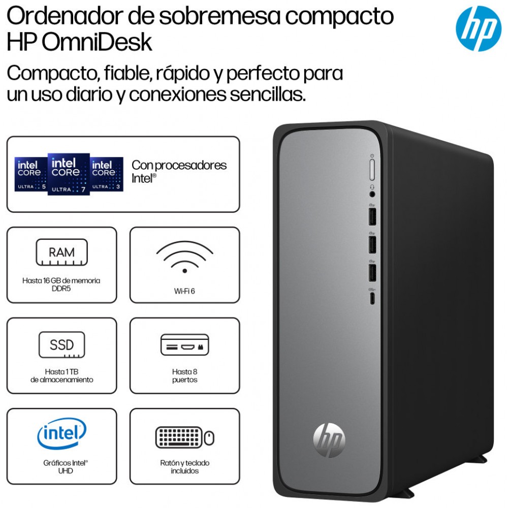 El ordenador de sobremesa compacto HP OmniDesk te permite gestionar fácilmente las tareas diarias, desde la organización de fotos familiares hasta la retransmisión de programas o la gestión de presupuestos. Este compacto y fiable ordenador de sobremesa cuenta con los últimos procesadores Intel[1], una amplia memoria para transferencias de datos rápidas, los últimos puertos de fácil acceso y una tecnología Wi-Fi rápida y fiable[3].