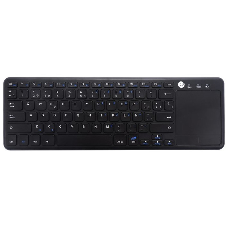 Especificaciones:. . Material: ABS. Conexión: Inalámbrica 2.4GHz, con mini-receptor USB incluido. Alcance inalámbrico: < 10m. Teclado:. • 78 teclas tipo chiclet. • Funciones multimedia. • Función de bloqueo del touchpad (Fn + Ctrl derecho). Touchpad:. • Multitáctil. • Tamaño: 89,6 x 74,6 mm. • 2 botones integrados. Alimentación: 2 pilas AAA (no incluidas). Vida útil: 3 millones de pulsaciones. Indicadores led: Bloqueo de mayúsculas, bloqueo numérico y estado de la batería. Requisitos hardware: Ordenador o dispositivo compatible con puerto USB libre. Dimensiones: 366,54 x 121,33 x 18,36 mm. Peso: 265 g (sin pilas). Contenido:. • Teclado. • mini-receptor USB. • manual de usuario