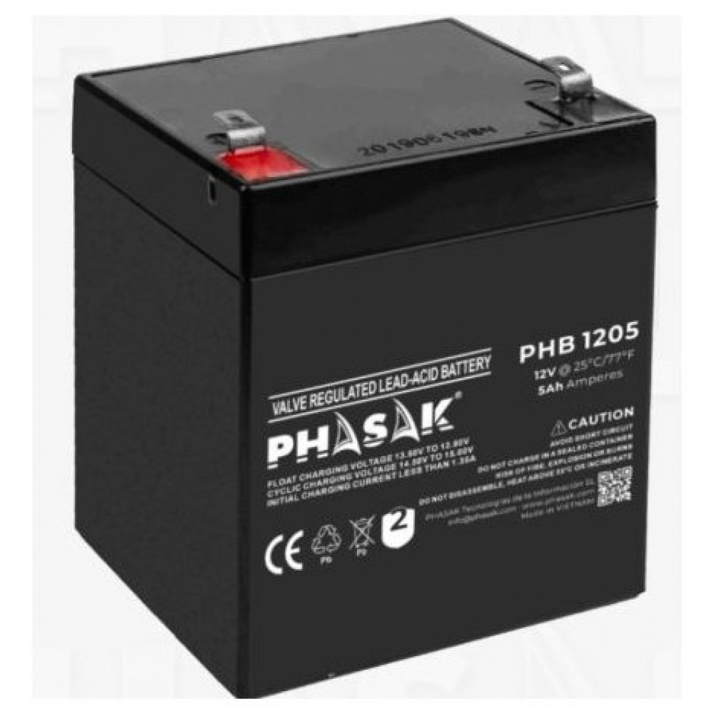 La PHASAK PHB 1205 es una batería sellada de plomo-ácido de 12 V y 5 Ah de capacidad, diseñada para sistemas de alimentación ininterrumpida (SAI/UPS), telecomunicaciones y otras aplicaciones críticas. Su construcción libre de mantenimiento y su diseño compacto la hacen fiable, eficiente y de instalación sencilla.