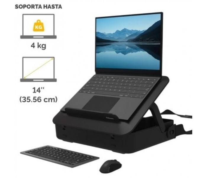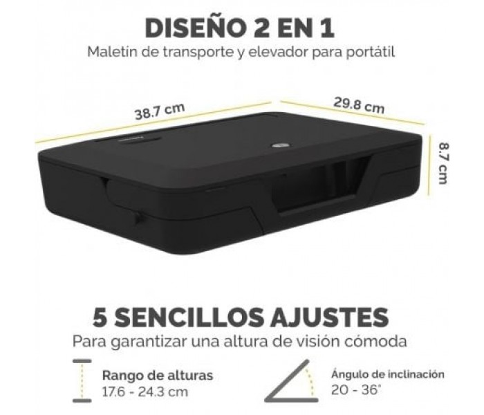 Maletín y Soporte elevador para portátil 2 en 1: permite colocar el portátil a la altura adecuada y guardarlo en su interior o poder transportarlo cuando no está en uso. 5 Configuraciones de altura. Diseño con estuche rígido compacto y ultraligero. Capacidad para portátiles de 14”, cargador y otros utensilios habituales. Asa integrada y correa de transporte extraíble. Fabricado con materiales 100% reciclables y duraderos, con garantía extendida de 5 años. Dimensiones (AnxProxAl): 38,7 x 29,8 x 8,7 cm. Peso 1,7 kg. Color negro