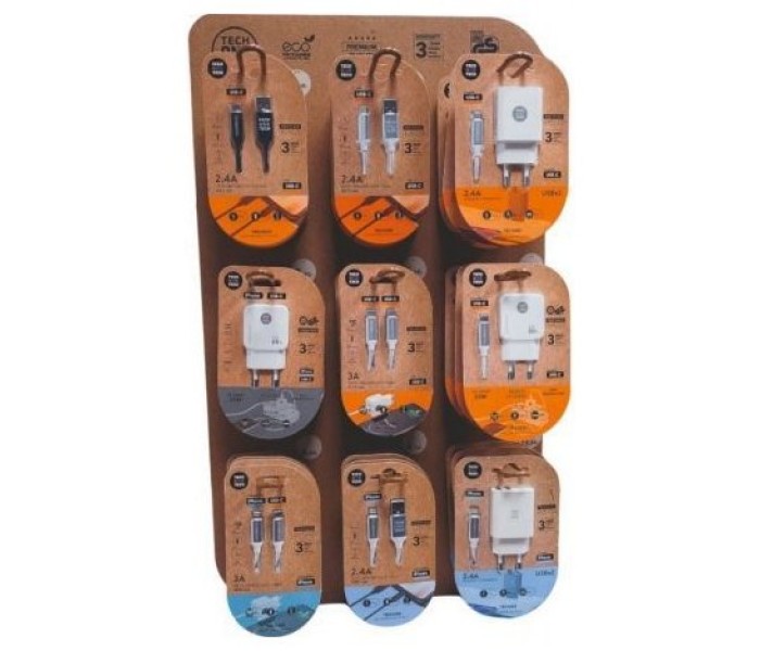 Elegante expositor de peana TECH ONE TECH, con 9 ganchos y 3 productos en cada gancho, total 27 productos de cargadores y cables más vendidos.