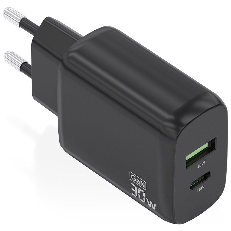 AISENS - CARGADOR GaN 30W, 1xUSB-C PD3.0 QC4.0, 1xUSB-A QC3.0, NEGRO