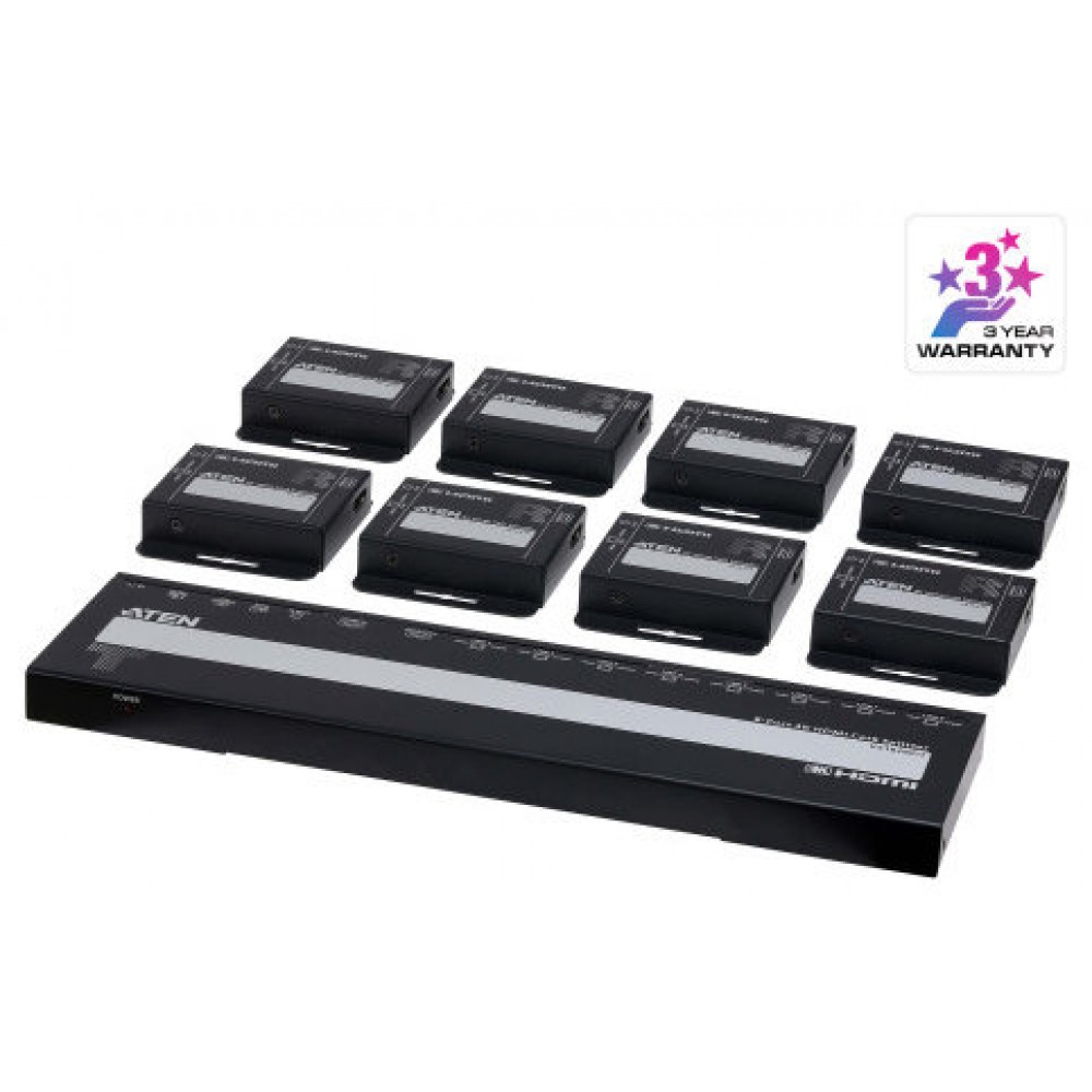 ATEN 8-PORT 4K HDMI CAT 6 SPLITTER WITH 8 RECEIVERS KIT, WITH LOCAL HDMI OUTPUT, IR RECEIVERS, AND POC (Espera 4 dias)