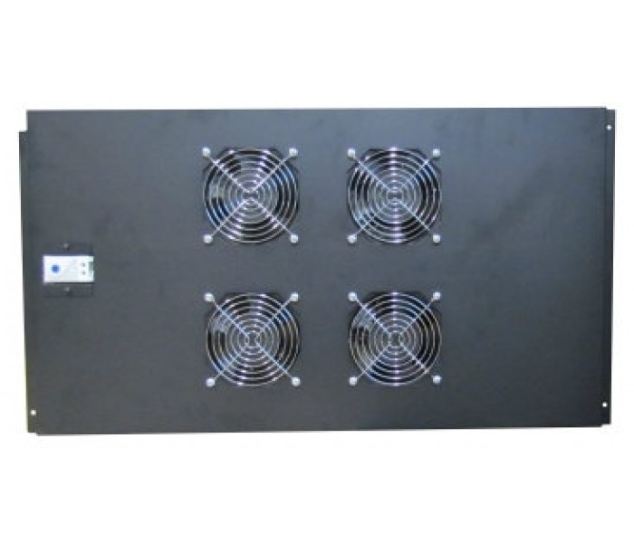 Unidad de ventilación con cuatro ventiladores que puede instalarse en la parte superior de armarios WP RACK serie RSA de 1.200mm de profundidad. La unidad de ventilación está equipada con un termostato para mantener controlada la temperatura interior del armario y evitar un consumo de electricidad excesivo.